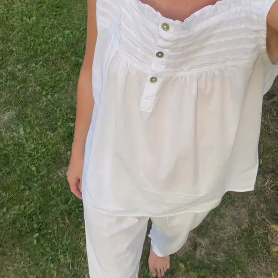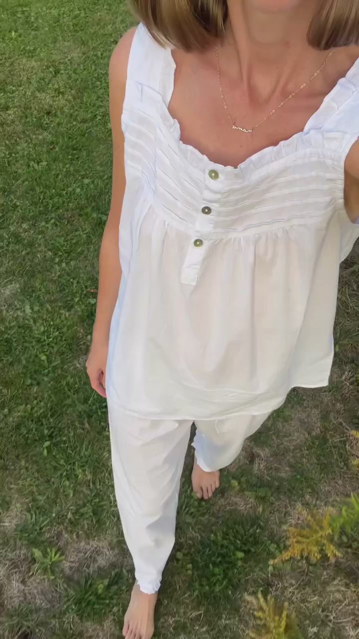 Sleep in our cool, comfortable Amanda PJ set. The 100% cotton is soft against the skin and will get softer after each wash. This PJ set features a gorgeous tank top with ruffle edge and pants with adjustable drawstring and ruffle on the hem. It's a special PJ that is perfect for every season.Â