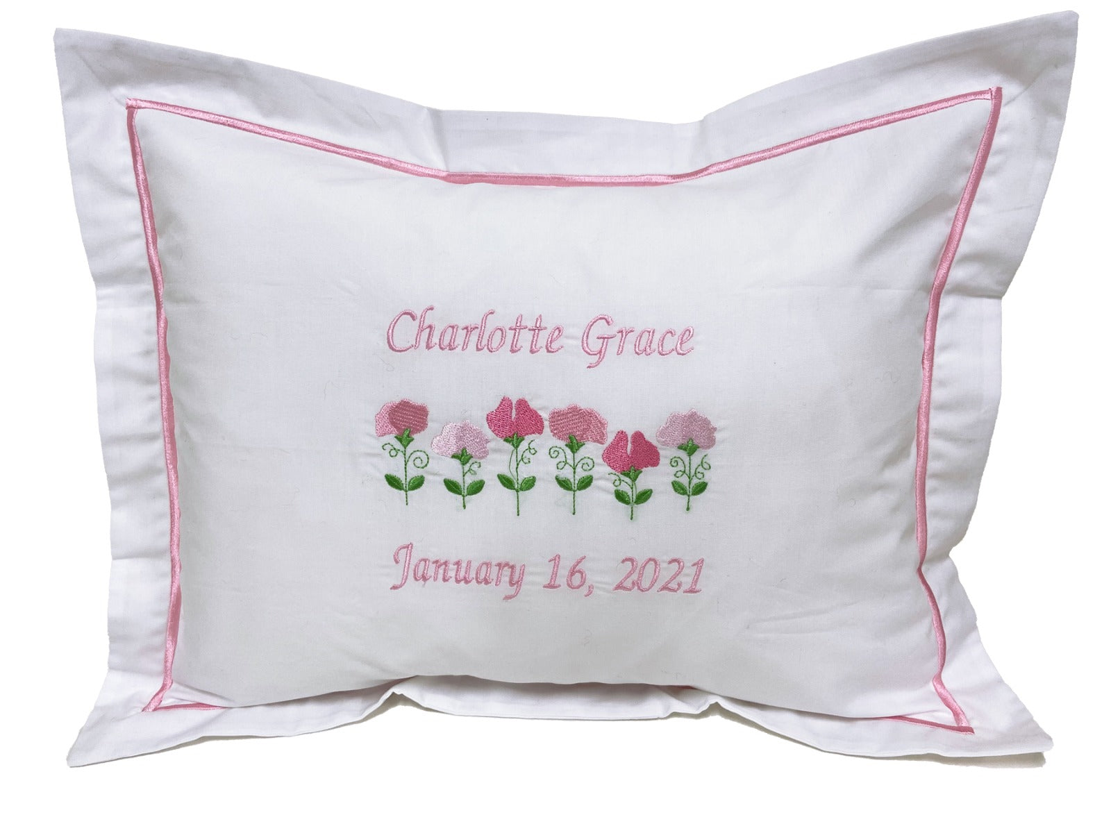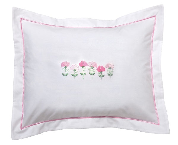 Add the decorative pink Row of Sweet Peas to your bedroom, daughter's bedroom or living room. Our super soft, white pillow covers are made with 100% cotton percale and elegantly embroidered.