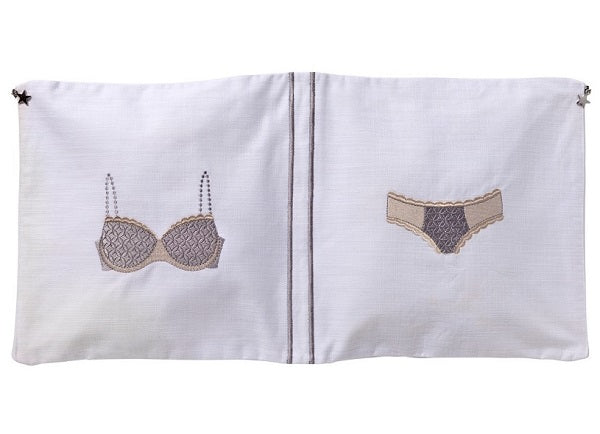 Made in South Africa, this Ladies and Girls' Underwear Bag features two separate pockets for laundry marked 'Wash' (unwashed) and 'Wear' (washed). Each pocket has separate zip up closures. This design is very useful when travelling.