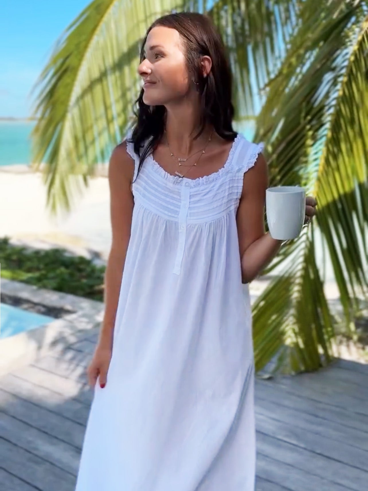 Get a good night's sleep in this gorgeous white cotton lawn Mandi nightgown that features strap sleeve, eyelet lace ruffle and pintucks on bodice. It is a simple nightie with a square neckline, buttons down the front, and very comfortable for lounging and sleeping at home.