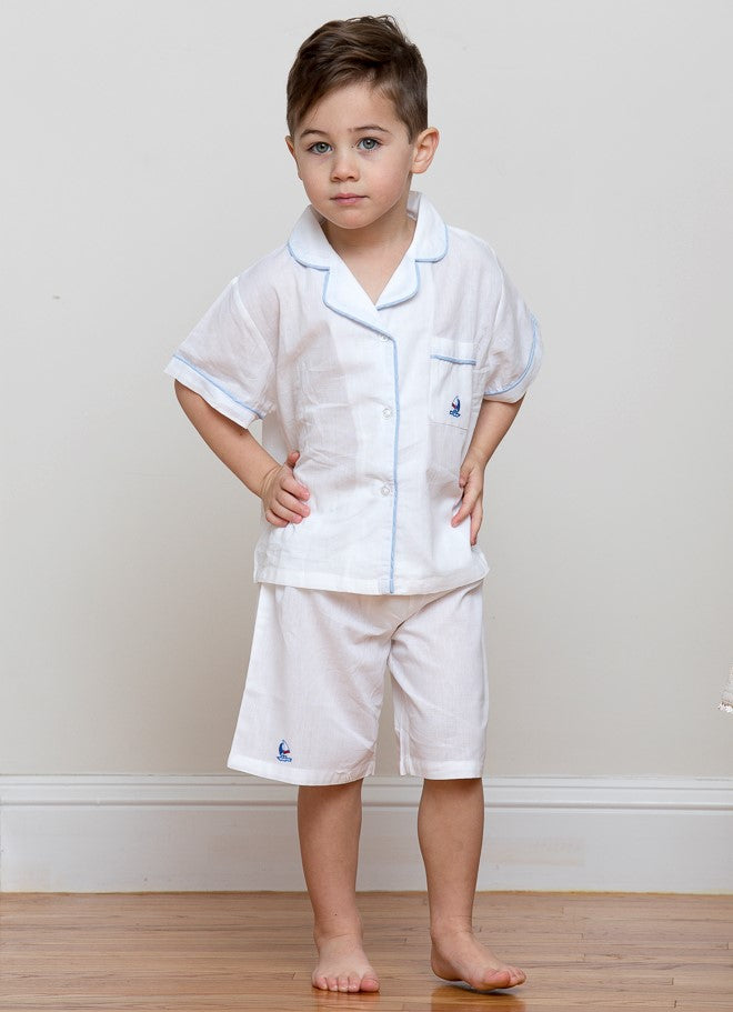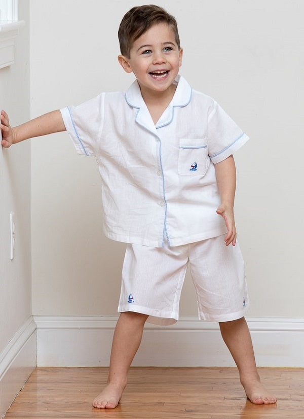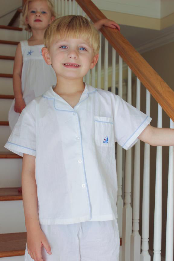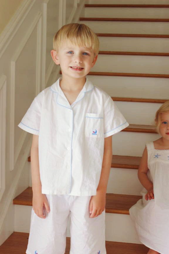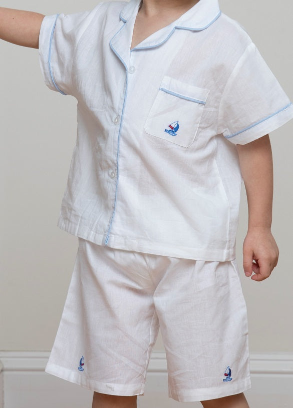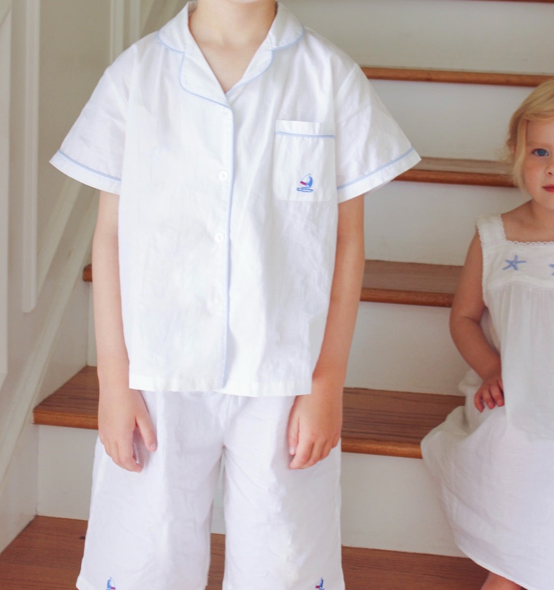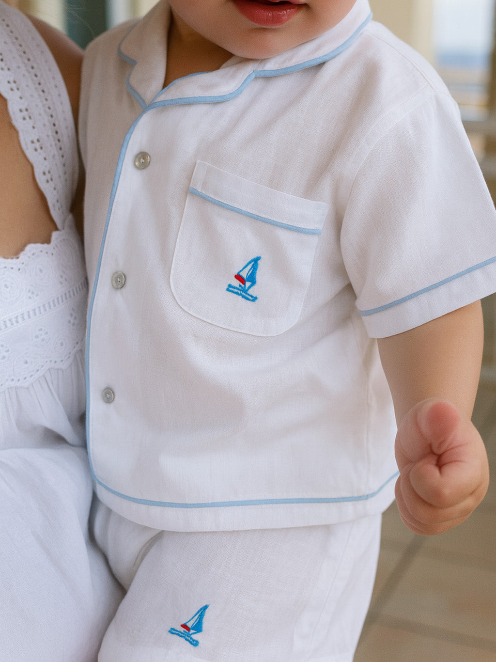 • Embroidered sailboat in blue and red on the pocket and pants hem