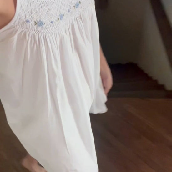 Light, breathable cotton and a romantic silhouette make the Grace a timeless favorite. Double straps, soft smocking, and hand-embroidered blue rosebuds add a feminine touch — perfect for warm nights, slow mornings, and everything in between.
