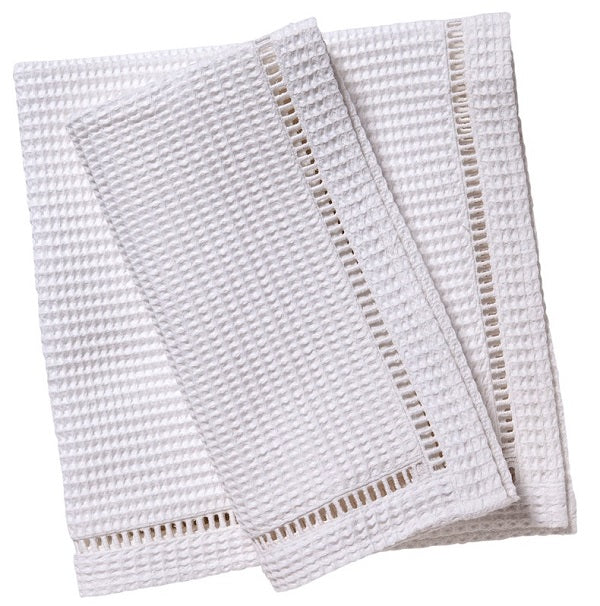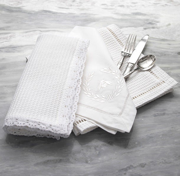 Dinner Napkins, White Waffle Weave, Ladder Lace Trim (Set of 2)