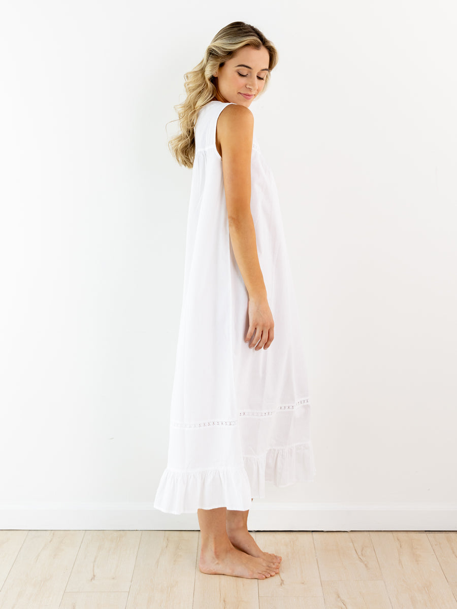 Light, breezy, and effortlessly elegant — the Theresa White Cotton Nightgown is crafted from soft cotton with delicate lace trim and features a high neckline, gentle ruffle hem, and a flattering mid-calf length for a romantic, feminine feel. Whether you’re lounging on slow mornings or winding down at night, it’s the perfect blend of comfort and sophistication.