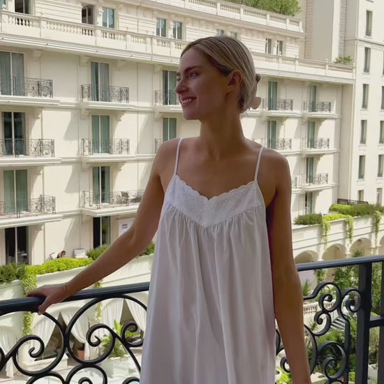 The Madeline features adjustable spaghetti straps, v-neck, scallop edge on the bodice with eyelet lace detail along the top. This cotton lawn nightie with short ruffle hem also looks gorgeous when worn with our short or long sleeve cotton bathrobes that have lace trims.Â