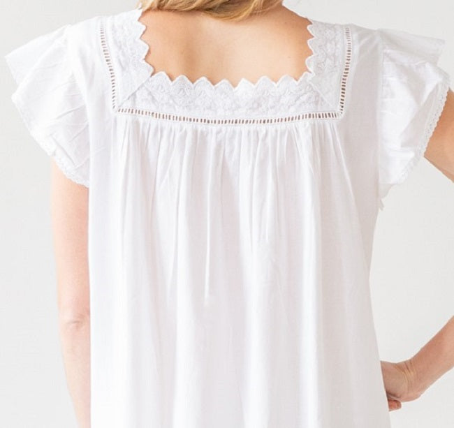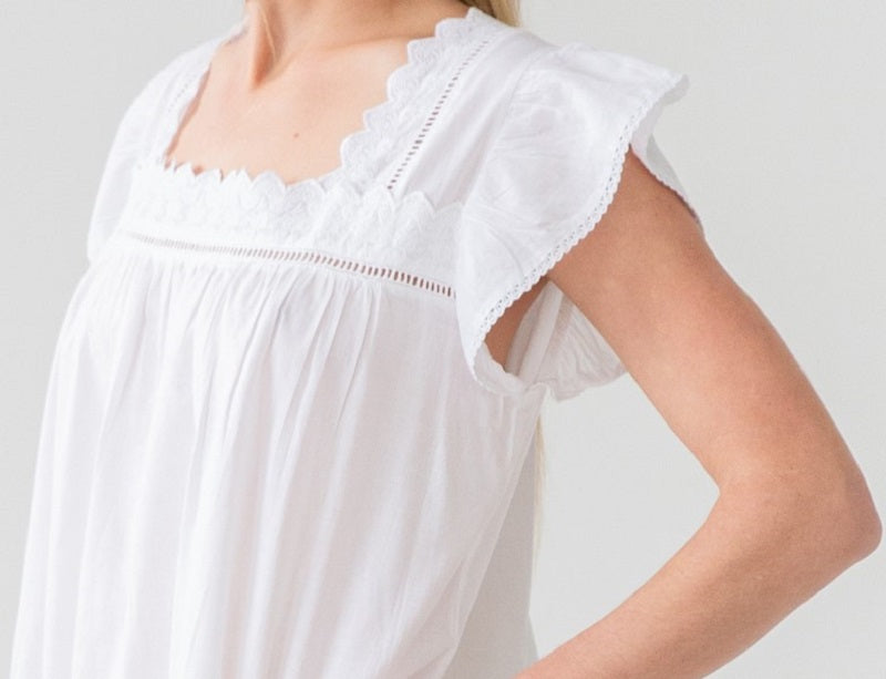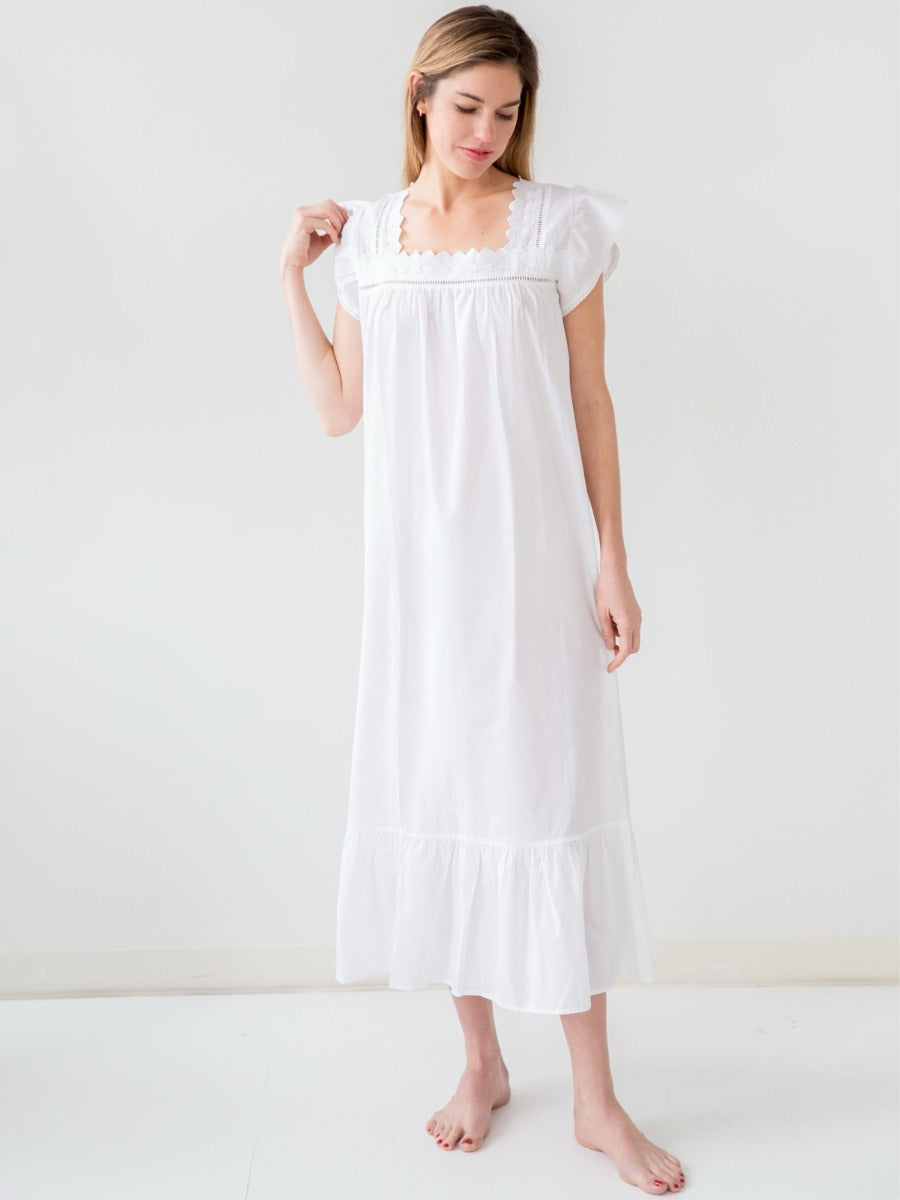 The Genevieve Nightgown is a soft, over-the-knee cotton style with butterfly cap sleeves, a scalloped square neckline, and a ruffled hem—perfect for cool nights.